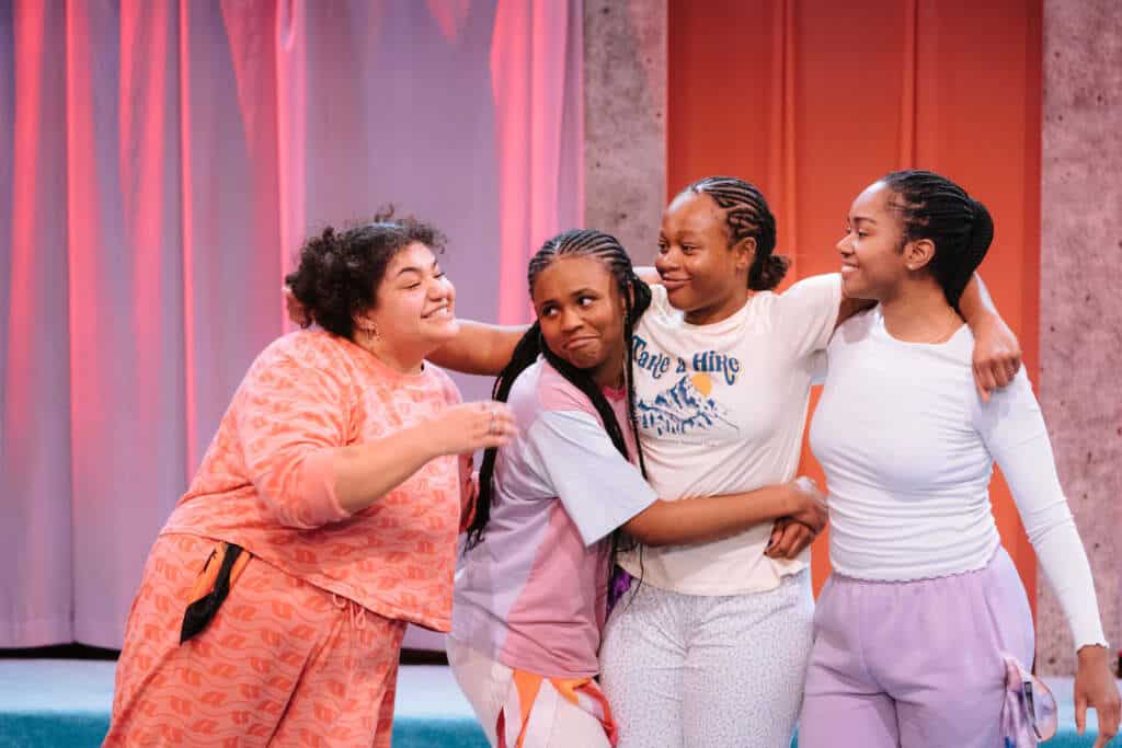 The show begins in 2016, in East London, with four childhood friends celebrating Shan’s (Aliyah Odoffin) 16th birthday with their first-ever sleepover. Shan is vibrant, and full of enthusiasm, despite her long-term health condition. Then we have Elle, the incredibly devout Christian (Shayde Sinclair) and Rey (Amber Grappy), the cool and confidently queer friend. The quartet is complete with the exuberant and proud Yoruba, Funmni (Bukky Bakray).